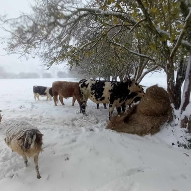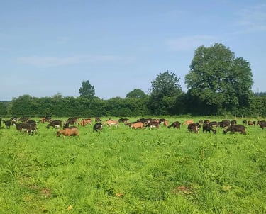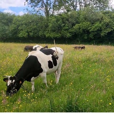 Comme ces dames sont un peu délicates et laissent beaucoup d'herbe derrière elles (elles ne mangent qu'à une certaine hauteur), nous élevons quelques bovins pour permettre de valoriser nos prairies comme il le faut en passant derrière les chèvres.