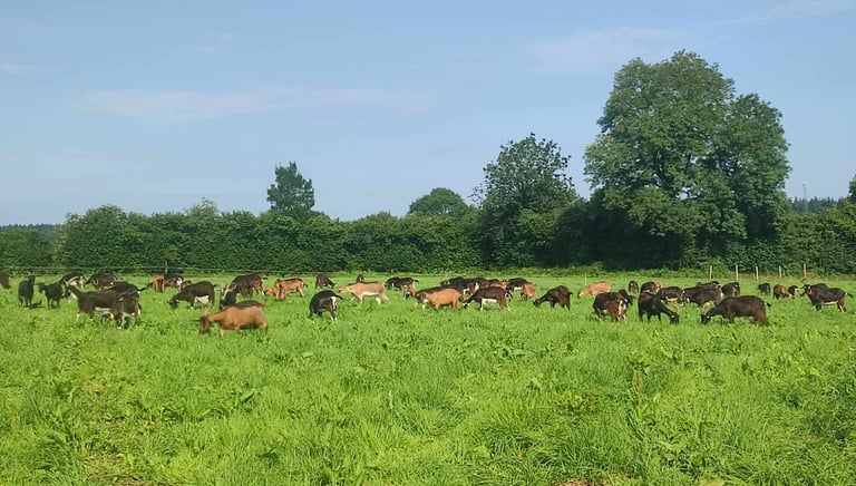 Notre activité principale est tournée vers l'élevage caprin, mais notre ferme comprend bien d'autres animaux ! En effet, nous attachons de l'importance à ce que notre ferme fonctionne comme un tout. Nos 70 chèvres laitières nous donne le lait nécessaire à la fabrication du fromage, mais elles élèvent également leurs chevrettes qui seront les futures générations du troupeau. Elles pâturent 9 mois de l'année, sur 32 hectares de prairies.
